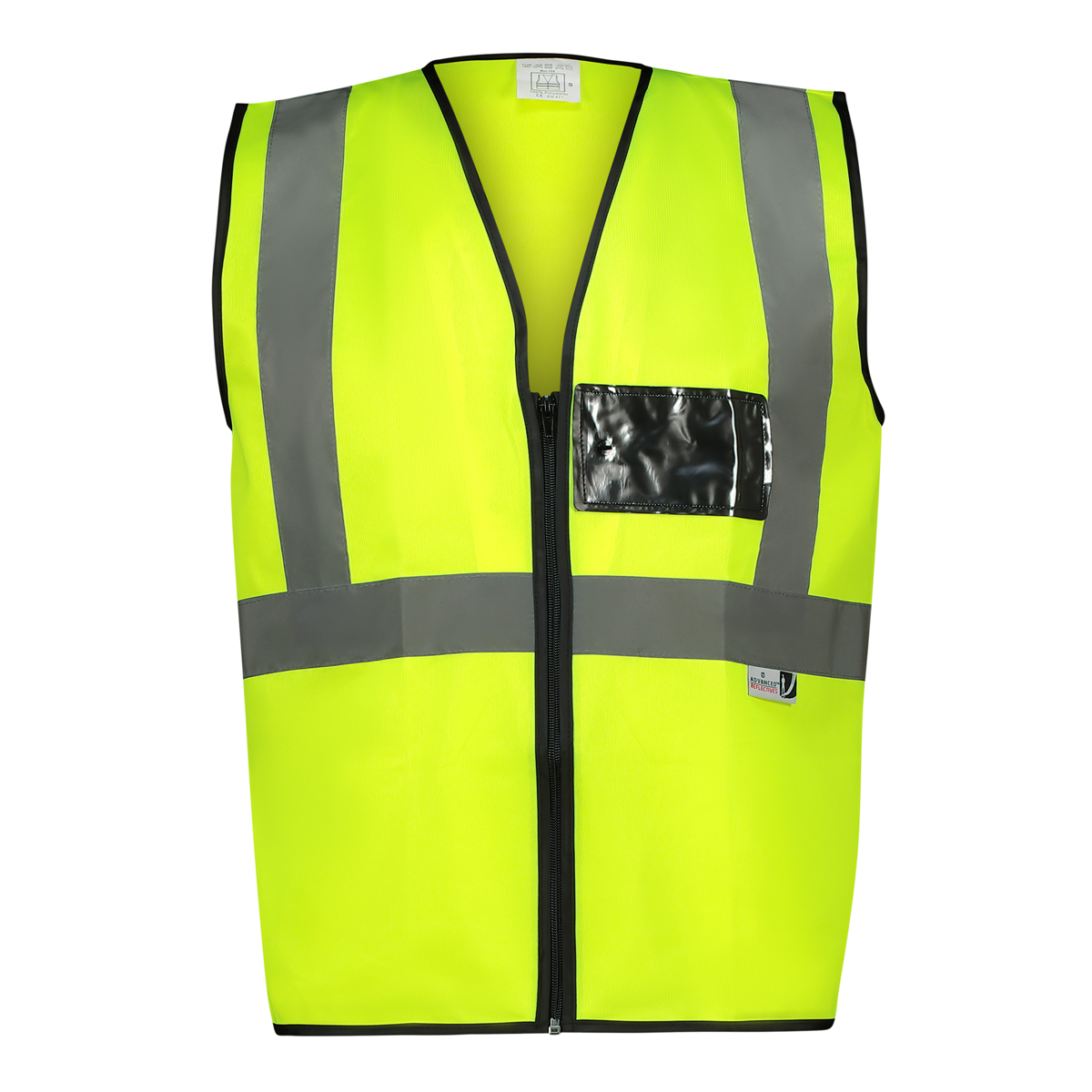 High-visibility reflective vest with a zip-up front for a secure fit, featuring a built-in name badge holder and reflective tape for enhanced visibility in low-light conditions.