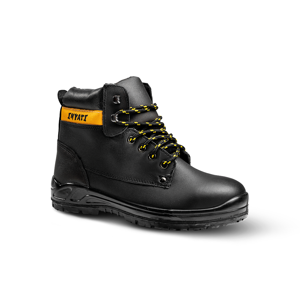 The Inyati Titanium Safety Boot is engineered for heavy-duty protection and long-lasting comfort in demanding work environments. A robust leather upper delivers excellent abrasion resistance and durability, while maintaining a clean, professional appearance. The dual density PU/rubber sole provides reliable performance with high heat resistance, cut protection and SR-rated slip resistance for secure footing on challenging surfaces. Inside, closed-cell foam padding around the collar enhances ankle comfort and support during extended wear. A steel toe cap comes standard, offering dependable impact protection and ensuring the boot is well suited to tough industrial applications.