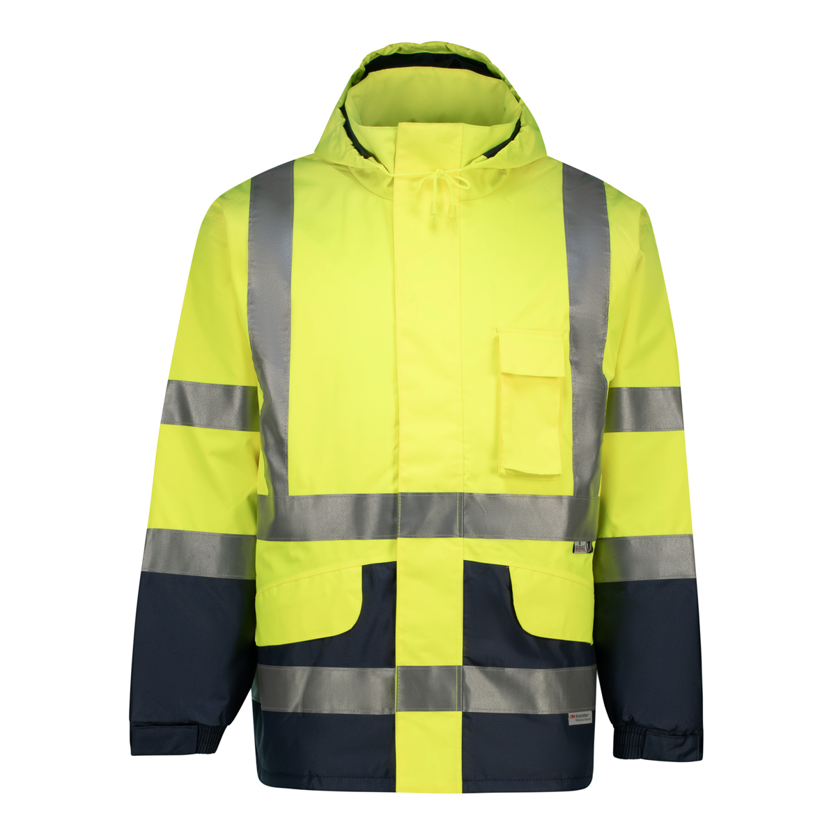The Hi-Viz 2-Tone Jacket is a durable, weatherproof and safety-compliant outerwear solution designed for demanding outdoor work environments. The jacket features a 300D polyester outer with PU coating for reliable H₂O protection, while the inner lining includes 160gsm padding in the body and 140gsm padding in the sleeves for warmth and comfort without restricting movement. Practical features include two front flap pockets, a concealed front zip with a press-stud storm flap, and inside ribbed sleeves that provide added protection against water ingress. Safety is ensured through 50mm EN 20471 reflective tape positioned on the arms, waist, chest and shoulders for enhanced visibility from all directions. The jacket also includes a fold-away hood, taped seams for improved waterproofing and full wind and H₂O resistance.