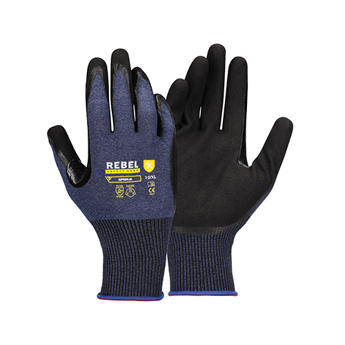 The REBEL VERSA premium glove, featuring a sandy nitrile coating and a 15-gauge nylon-spandex liner, combines comfort and durability with outstanding performance. The double-dipped palm coating enhances grip, while the elasticated knit wrist ensures a secure fit. Specially designed for flexibility and dexterity, it is also touchscreen compatible, providing convenience in modern work environments. Reinforced thumb and index finger saddles add extra protection, making it highly durable. The breathable nitrile material ensures comfort during extended wear, while its exceptional abrasion resistance makes it suitable for tough tasks. Oeko-Tex certified, this glove meets sustainability standards, offering both protection and environmental responsibility.