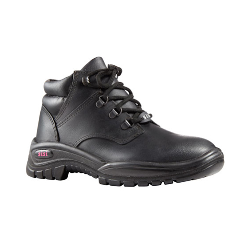 The SiSi Cate Ladies Safety Boot offers dependable protection and comfort for demanding work environments. Made from durable full grain leather, the boot features a padded collar and tongue to enhance comfort and ankle support. A secure lace-up system with rust-resistant D-rings and hooks allows for easy fastening and quick removal. Inside, a needle-fibred vamp lining provides excellent perspiration absorbency, while the anti-static in-sock and anti-bacterial Energiser top sock with EVA inserts improve comfort and shock absorption. Shank reinforcement delivers reliable arch support, with an optional steel midsole available for added underfoot protection. A dual density PU/PU sole with heat resistance up to 95°C is paired with a steel toe cap for essential impact protection.
