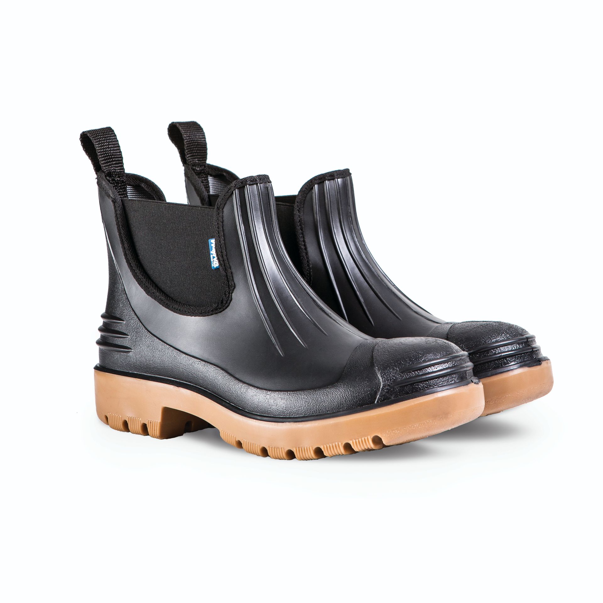 - Upper: PVC, waterproof. Elasticated side gussets for ease of entering and exiting the boot.